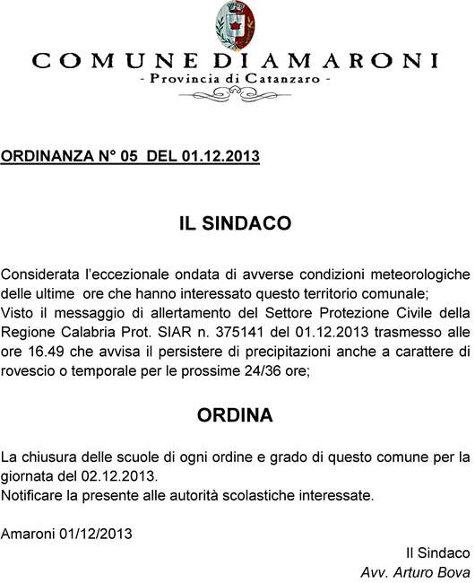 Oggetto: Newsletter Comune di Amaroni:Chiusura scuole del 02 dicembre2013